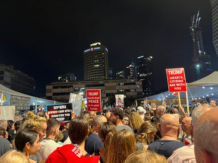 Last Saturday night, as talk of the deal was in the air, I went to the weekly protest again, wondering if this one might be the last. One speaker estimated that 200,000 people were there; the newspaper Ha’aretz gave a more conservative count of “tens of thousands,” but regardless, the square was packed. By now, only 48 hostages out of the original 250 remain in Gaza; many are known to be dead. Speaker after speaker praised Trump for bringing the latest deal to the table and implored Netanyahu to comply with it.
