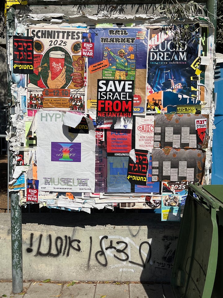 I’ve visited Israel several times since the pro-democracy protests of summer 2023. Each time, the mood among most of the people I know here has ranged from bleak to despondent. In May 2024, when I first attended one of the weekly Saturday protests held on the plaza outside the Tel Aviv Art Museum—now known as “Hostages Square”—the public despair felt overwhelming. In speeches broadcast on huge screens and audible for blocks around, family members of the hostages begged Netanyahu to end the war and bring their loved ones home. Graffiti around the city called him a liar, a traitor, and worse.