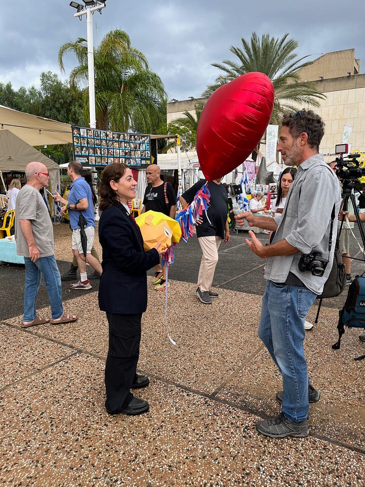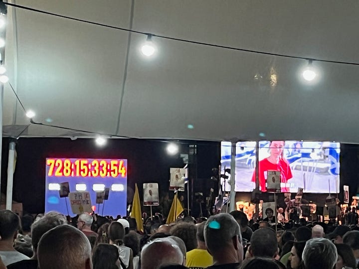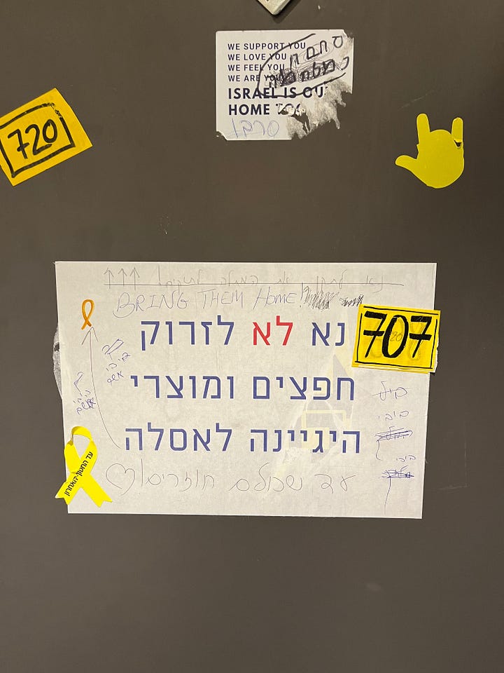Listening in, I experienced the cognitive dissonance that I’ve felt more or less constantly since arriving in Israel for this latest visit. I’ve been mainly in Tel Aviv, which looks and feels much the same as always: filled with Israelis riding buses, sitting in cafes, going to the beach, and in general living their lives, even as the aftershocks of October 7 are everywhere. The protest signs and graffiti have only grown angrier: “10/7 BECAUSE OF YOU,” reads a poster bearing Netanyahu’s face. In a public bathroom, the usual admonition not to throw garbage in the toilet is plastered with hostage memorabilia: yellow stickers counting the number of days in captivity, a yellow ribbon printed with the message “Until the last hostage [comes home].” “Bring them home!” someone has written in English.